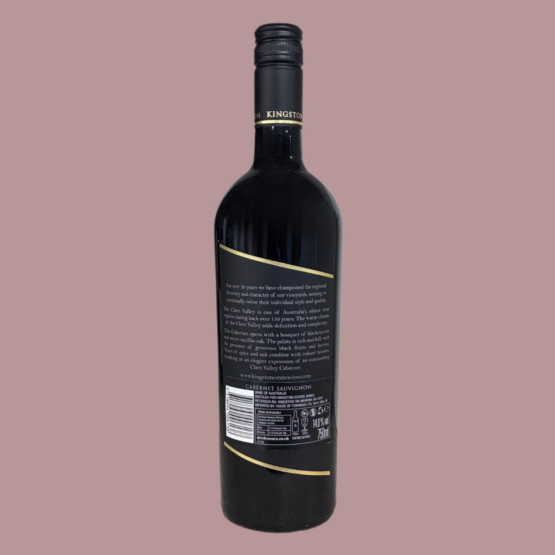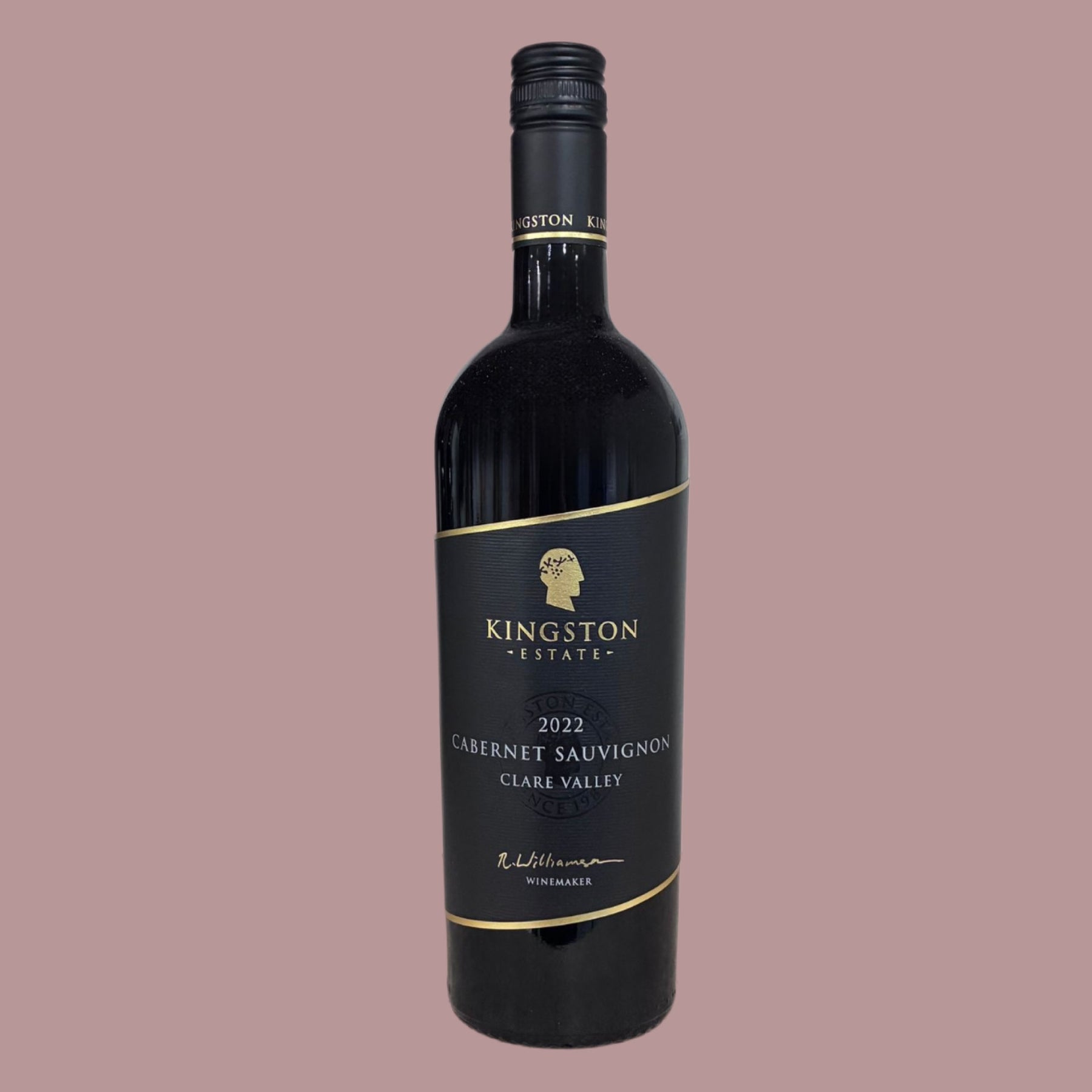 Kingston Estate Cabernet Sauvignon is deep purple with a ruby hue, showing aromas of blackcurrant, cassis, and subtle stewed plum with a touch of spicy oak. Full-bodied and elegant, the palate reveals dark fruit, hints of mint and capsicum, and a smooth oak finish.