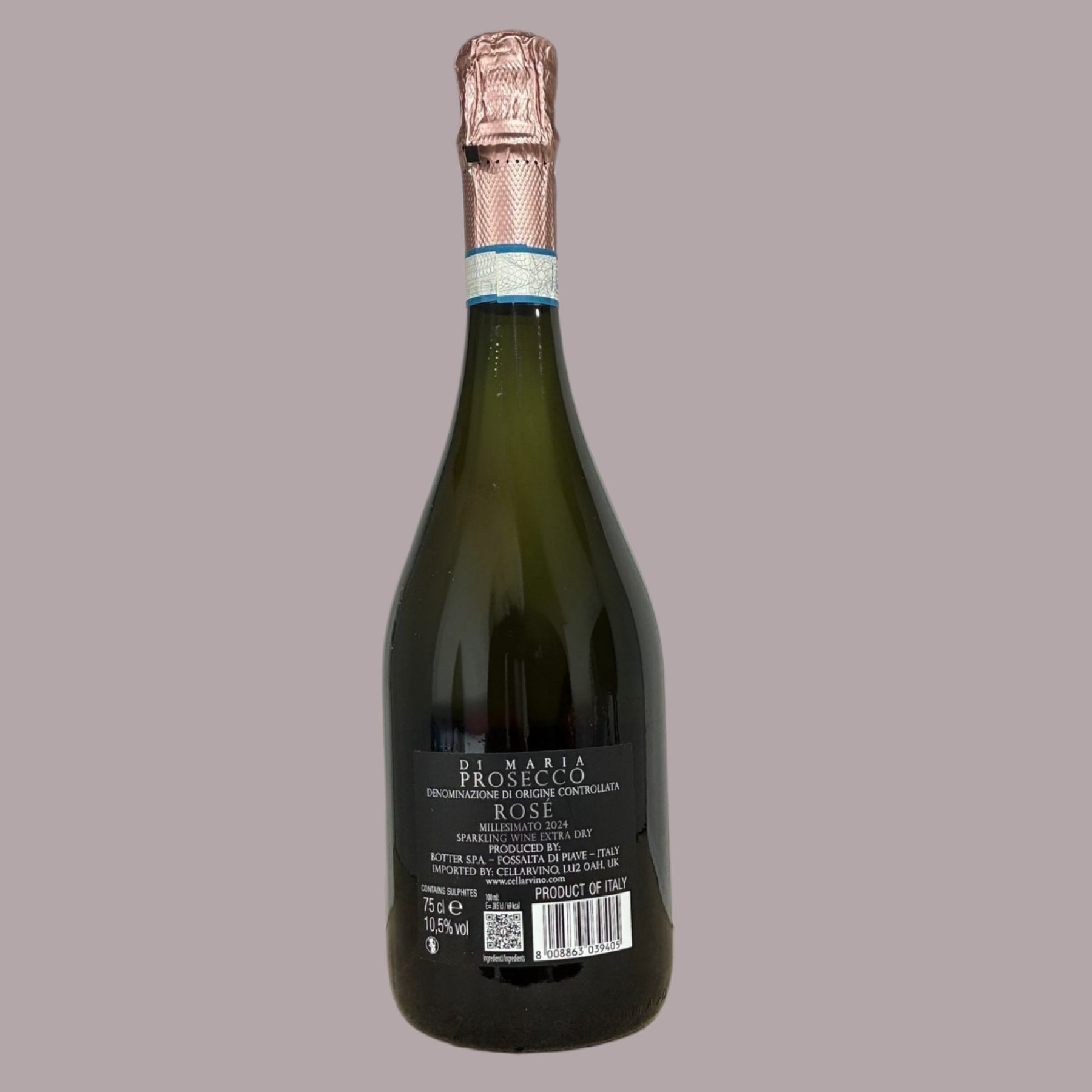 This Prosecco Rosé displays a delicate light pink hue with an elegant and intense bouquet. On the palate it is dry, soft, and well-balanced, with a round, full-bodied structure that carries its lively freshness beautifully.