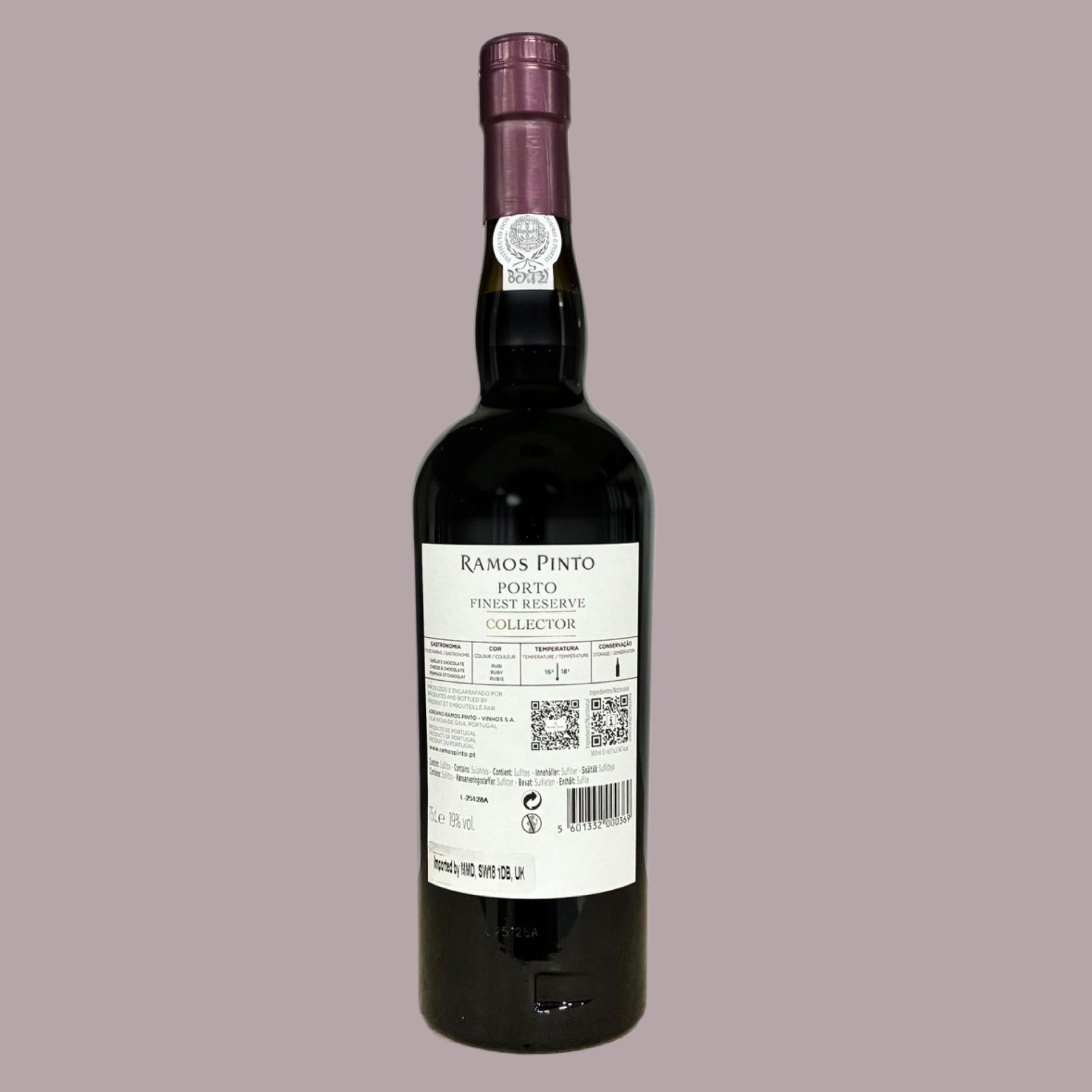 Ramos Pinto Collector Finest Reserve Port shows an intense, opaque red colour and an aromatic profile driven by powerful, ripe fruit — black plum, fig, blackberry, raspberry and cherry. The palate opens smoothly, carrying impressive volume and concentration, while hints of black pepper and dark chocolate shape a persistent, well-balanced finish.