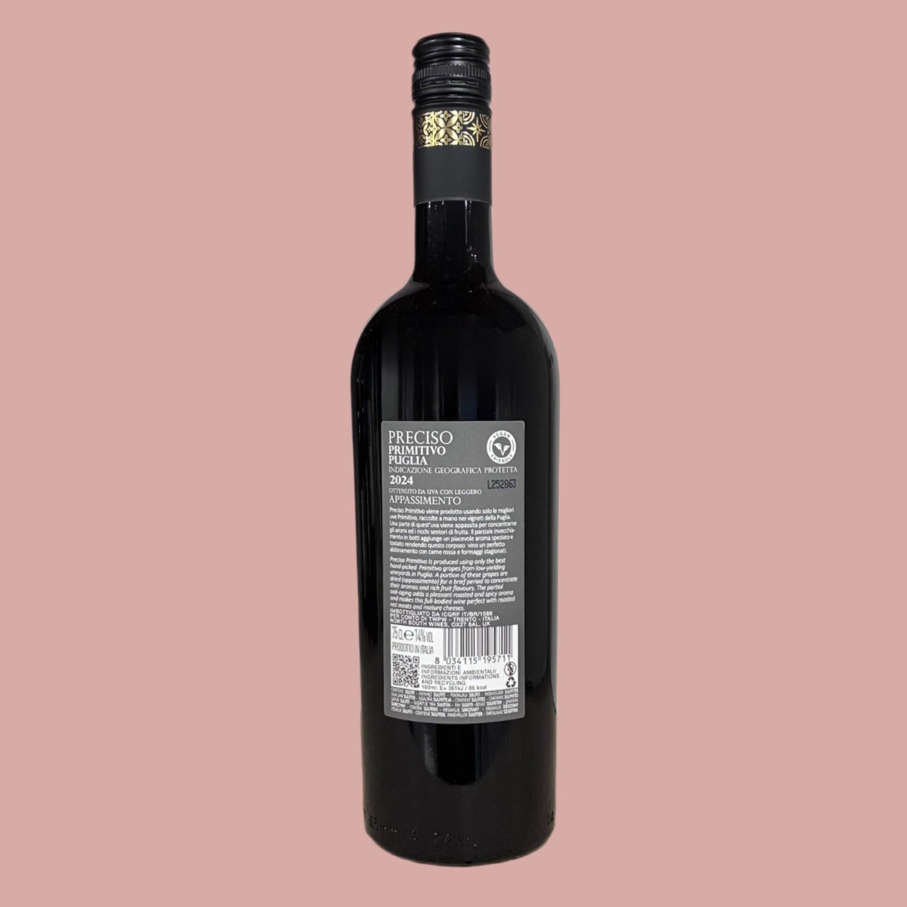 Preciso Appassimento Primitivo is a deep ruby-red Primitivo from Puglia, made in the Appassimento style for extra richness. The nose shows ripe cherries, raspberries, and currants with a touch of toasty spice from oak. Full-bodied and smooth, the palate offers dried fruit, hints of raisin, ripe plums, and gentle spice, leading to a rich, well-balanced finish with sweet fruit character.